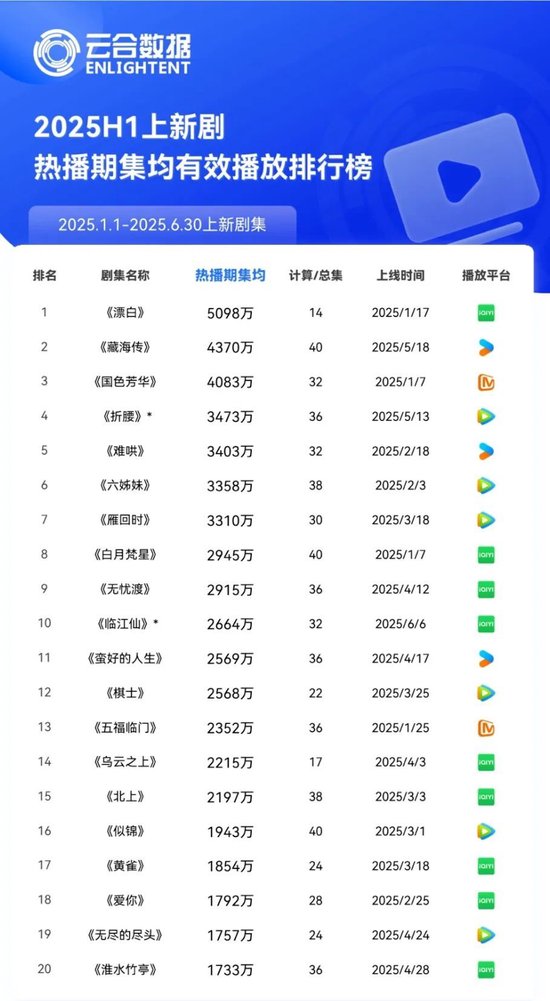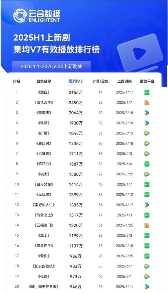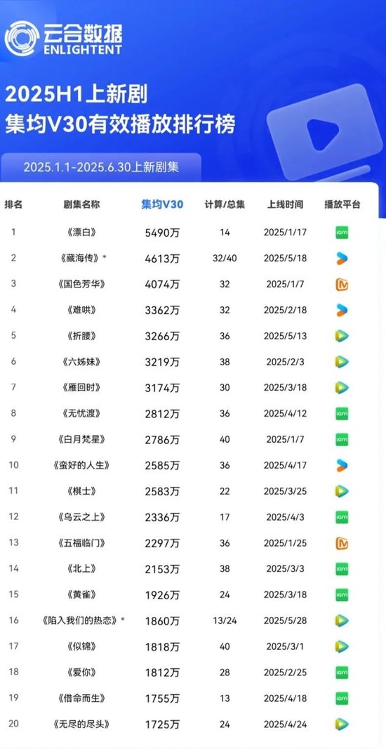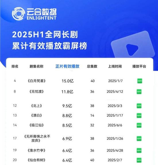 2025年上半年,爱奇艺在剧集市场播放表现既惊喜又亮眼。云合数据《2025上半年长剧集网播表现与上新观察》报告中,爱奇艺在累计有效播放霸屏榜、集均V30及V7有效播放、热播期集均有效播放等多个榜单中,从数量到质量均有着领先优势。